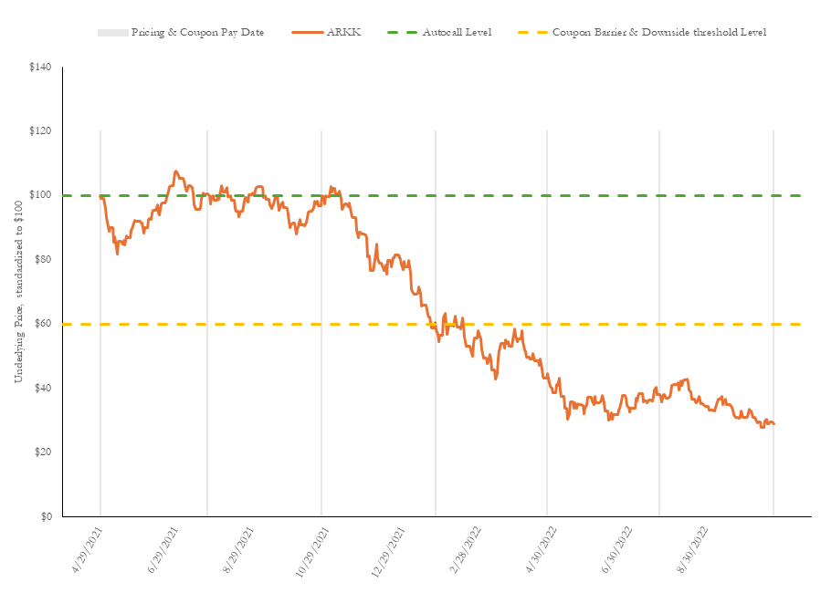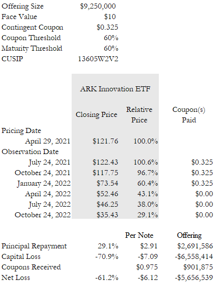 $9,250,000 Canadian Imperial Bank of Commerce Senior Global Medium-Term Notes Market Linked Securities -- Auto-Callable with Contingent Coupon and Contingent Downside Principal at Risk Securities Linked to the ARK Innovation ETF due October 27, 2022, priced on April 29, 2021, were issued by Canadian Imperial Bank of Commerce. The pricing supplement for this note (CUSIP: 13605W2V2) can be found here. The notes had a $10 face value and paid a quarterly coupon of $0.325, so long as the notes had not been called and and ARK Innovation ETF all closed above 60% of their April 29, 2021 closing prices on a determination date. If and ARK Innovation ETF closed below 60% of their April 29, 2021 closing prices on a determination date, the notes did not pay a coupon. If not previously called, at maturity, the notes returned $10 in principal if and ARK Innovation ETF all closed on the final determination date on October 24, 2022 and above 60% of their April 29, 2021 closing prices. If on October 24, 2022 and ARK Innovation ETF closed below 60% of their April 29, 2021 closing prices, the notes paid reduced principal euqal to $10 multiplied by the lowest ratio of and ARK Innovation ETF October 24, 2022 closing prices to their April 29, 2021 closing prices. The notes have matured. They paid three coupons totaling $0.975 and $2.91 repayment per $10 note. Investors thus suffered capital losses of $7.09 and net losses of $6.12.† In the aggregate, investors in this note suffered $6,558,414 in capital losses and $5,656,539 in net losses. See Table 1 and Figure 1.
