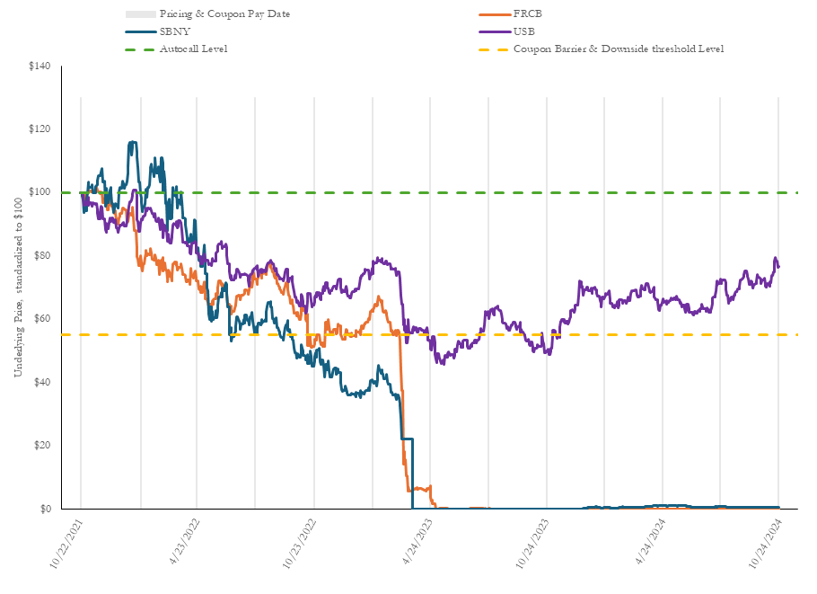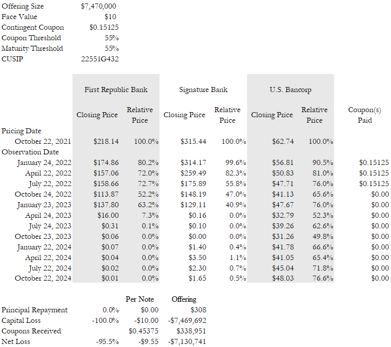 $7,470,000 Auto-Callable Contingent Income Securities All Payments on the Securities Subject to the Coupon Barrier and Downside Threshold Features Based on the Performance of the Worst Performing of Three Underlyings due October 25, 2024, priced on October 22, 2021, were issued by Credit Suisse AG. The pricing supplement for this note (CUSIP: 22551G432) can be found here. The notes had a $10 face value and paid a quarterly coupon of $0.15125, so long as the notes had not been called and Signature Bank, U.S. Bancorp and First Republic Bank all closed above 55% of their October 22, 2021 closing prices on a determination date. If Signature Bank, U.S. Bancorp and First Republic Bank closed below 55% of their October 22, 2021 closing prices on a determination date, the notes did not pay a coupon. If not previously called, at maturity, the notes returned $10 in principal if Signature Bank, U.S. Bancorp and First Republic Bank all closed on the final determination date on October 22, 2024 and above 55% of their October 22, 2021 closing prices. If on October 22, 2024 Signature Bank, U.S. Bancorp and First Republic Bank closed below 55% of their October 22, 2021 closing prices, the notes paid reduced principal euqal to $10 multiplied by the lowest ratio of Signature Bank, U.S. Bancorp and First Republic Bank October 22, 2024 closing prices to their October 22, 2021 closing prices. The notes have matured. They paid five coupons totaling $0.45375 and $0.00 repayment per $10 note. Investors thus suffered capital losses of $10.00 and net losses of $9.55.† In the aggregate, investors in this note suffered $7,469,692 in capital losses and $7,130,741 in net losses. See Table 1 and Figure 1.
