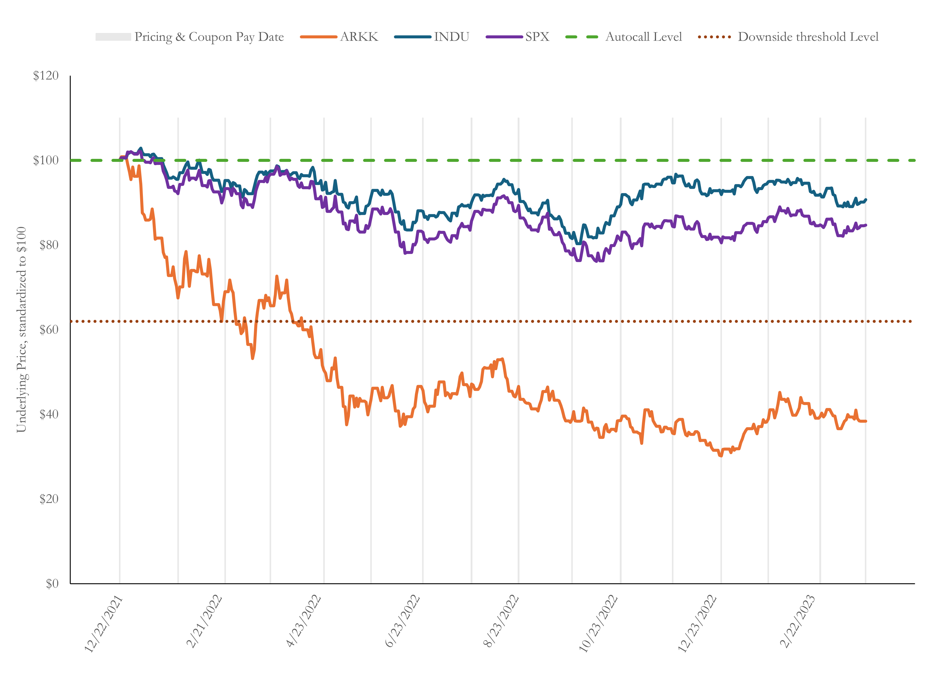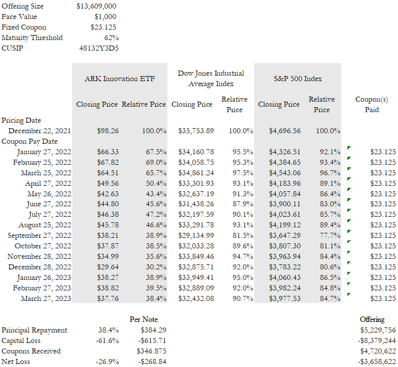 $13,609,000 Auto Callable Yield Notes Linked to the Least Performing of the S&P 500 Index, the Dow Jones Industrial Average TM and the ARK Innovation ETF due March 27, 2023, priced on December 22, 2021, were issued by JPMorgan Chase Financial Company LLC. The pricing supplement for this note (CUSIP: 48132Y3D5) can be found here. The notes had a $1,000 face value and paid a fixed coupon of $23.125 monthly so long as the notes had not been called. If not previously called, at maturity, the notes returned $1,000 in principal if Dow Jones Industrial Average Index, S&P 500 Index and ARK Innovation ETF all closed on the final determination date on March 22, 2023 and above 0% of their December 22, 2021 closing prices. If on March 22, 2023 Dow Jones Industrial Average Index, S&P 500 Index and ARK Innovation ETF closed below 0% of their December 22, 2021 closing prices, the notes paid reduced principal euqal to $1,000 multiplied by the lowest ratio of Dow Jones Industrial Average Index, S&P 500 Index and ARK Innovation ETF March 22, 2023 closing prices to their December 22, 2021 closing prices. The notes have matured. They paid three coupons totaling $346.875 and $384.29 repayment per $1,000 note. Investors thus suffered capital losses of $615.71 and net losses of $268.84.† In the aggregate, investors in this note suffered $8,379,244 in capital losses and $3,658,622 in net losses. See Table 1 and Figure 1.